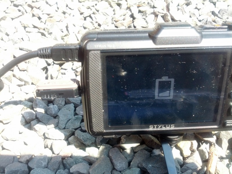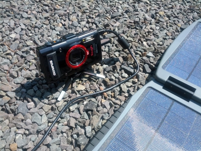 During my test of the 2 devices, there was enough sun to charge the Olympus TG-2 camera at full charge. When the sun disappeared behind the clouds the red charging LED was still on, which indicates that the charging continued. After around 4 hours the battery indicated fully charged.